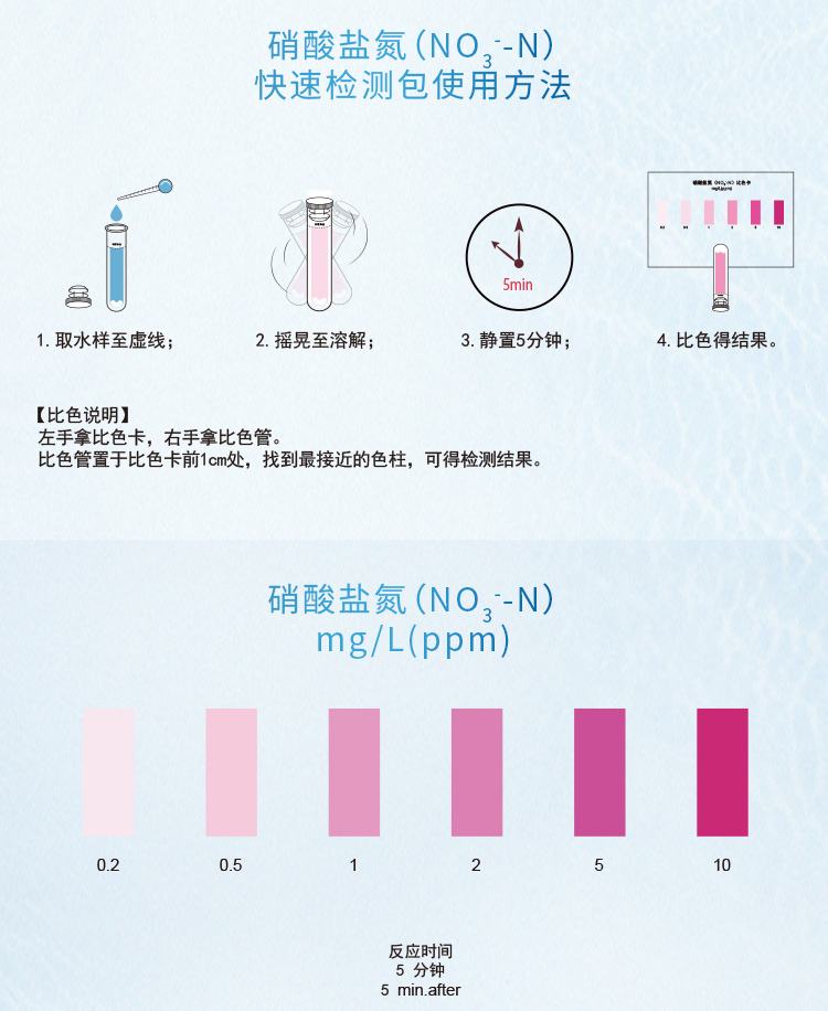 2.本產(chǎn)品檢測水中硝酸鹽氮(NO3- -N)含量在0.2-10mg/L(ppm)范圍內,若要檢測5mg/L以上濃度水樣,請預先稀釋水樣后再進行測定,具體操作見稀釋說明書。