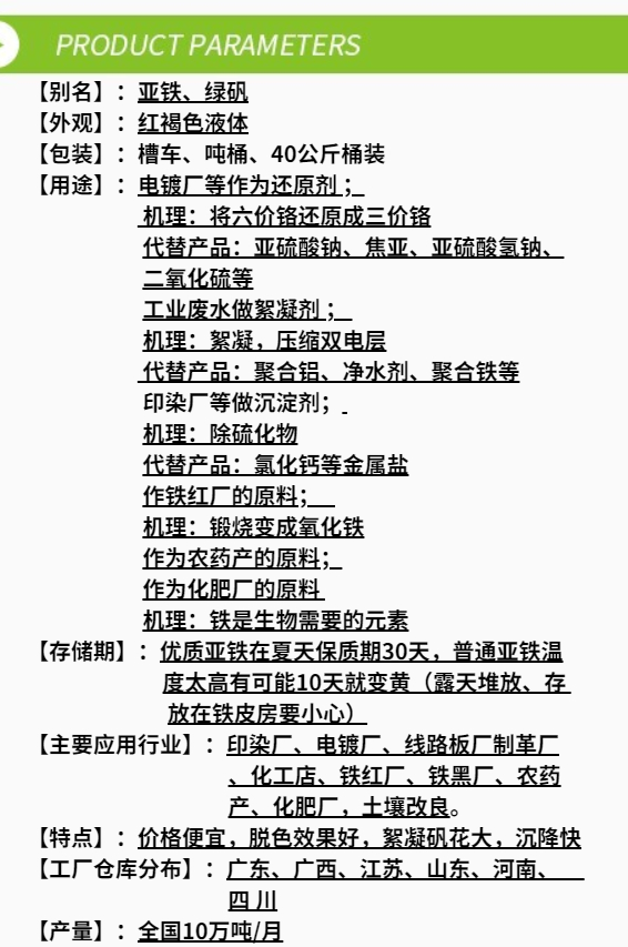 廣泛用于印染,造紙,生活污水,工業廢水的絮凝澄清與脫色,硫酸亞鐵還可用以處理含鉻廢水和含鎘廢水.等高堿度,高色度廢水處理,可以減少中和用酸的大量投入。