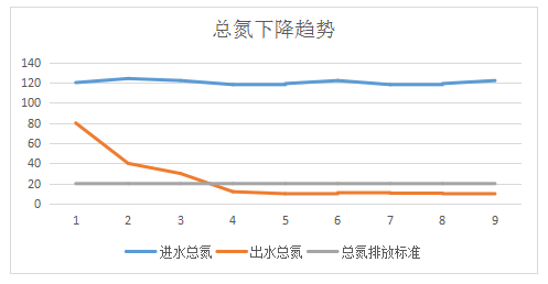 采用庫巴魯生化修復方案后,出水總氮由80mg/L持續(xù)下降,最終穩(wěn)定出水TN在10mg/L左右,達到一級B排放標準。